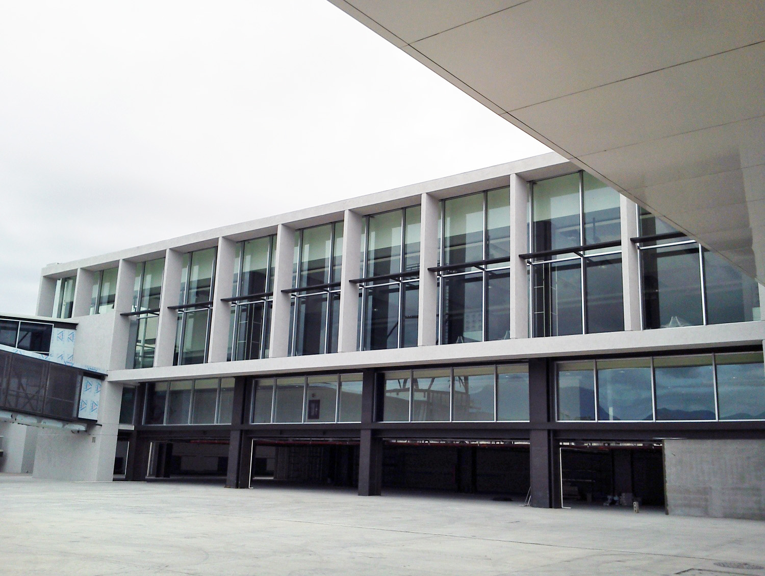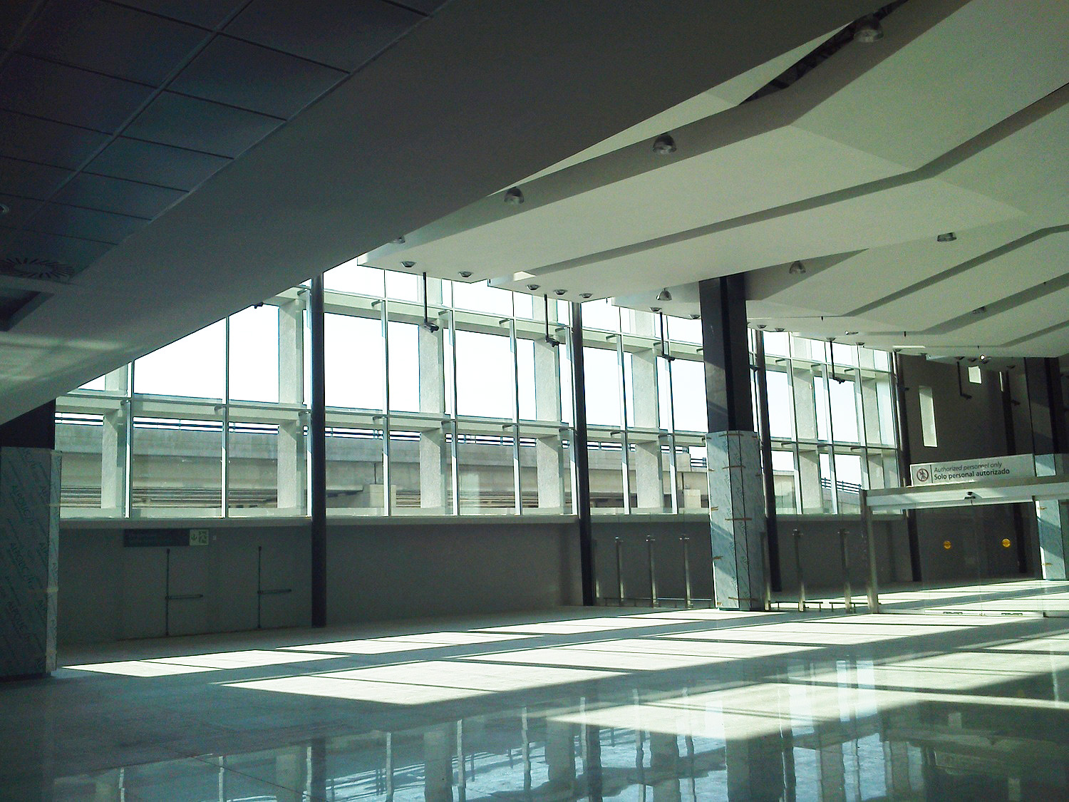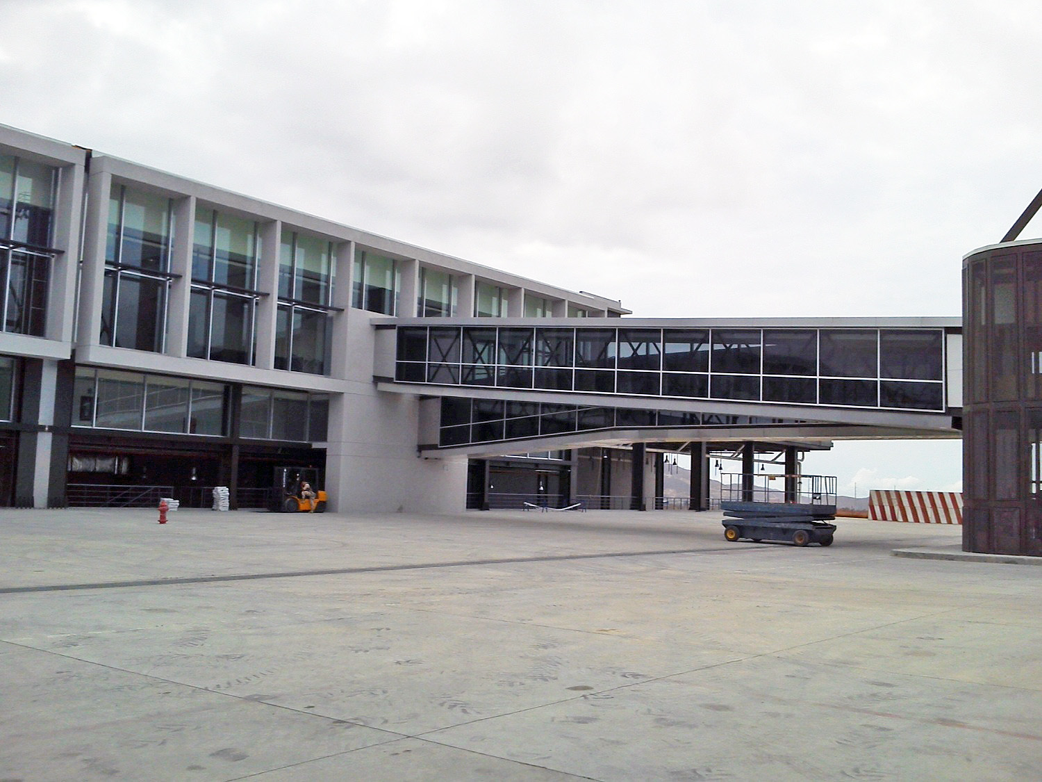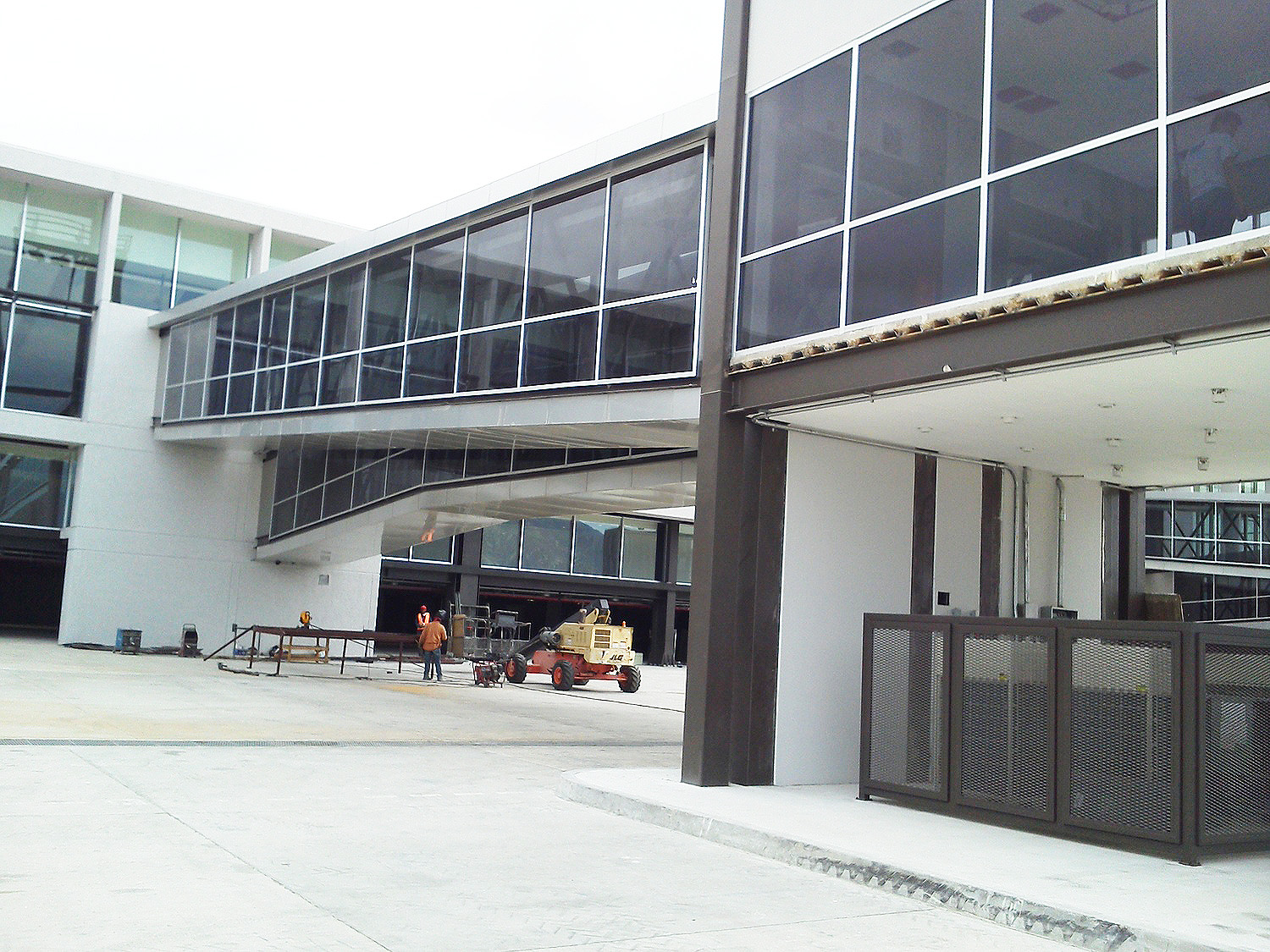 Estructura de acero parasoles de duroc fechadas lado tierra, lado aire accesos y costados cristal LOW-E y claro de 10mm laminado con centryglas