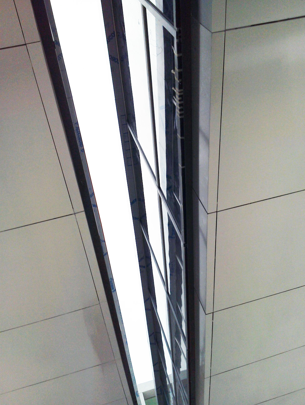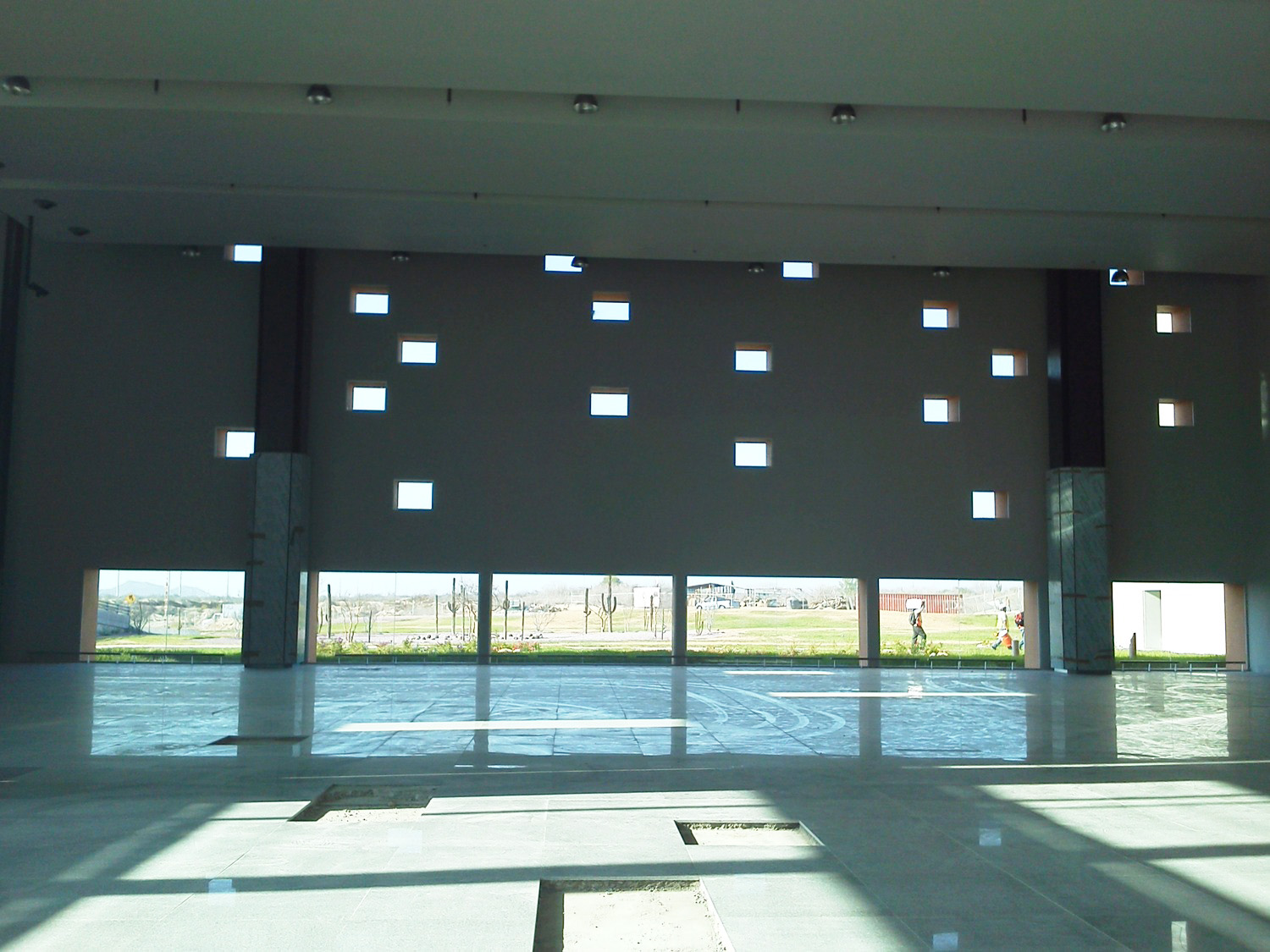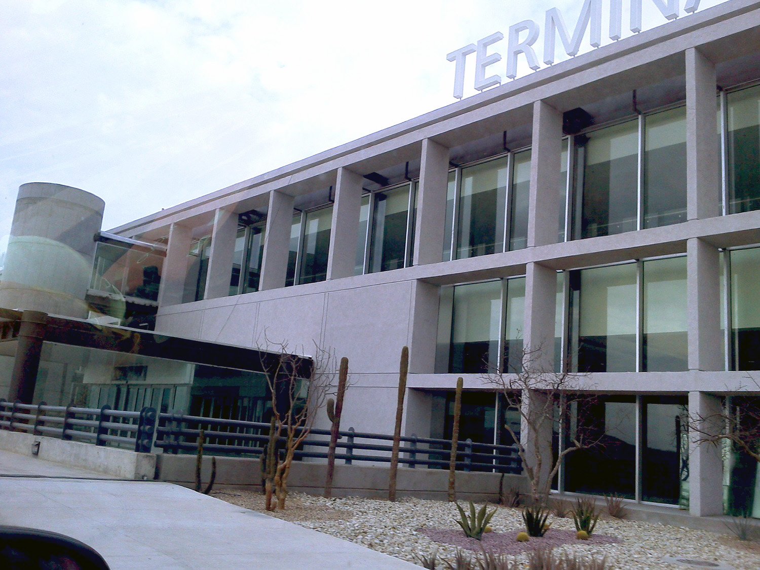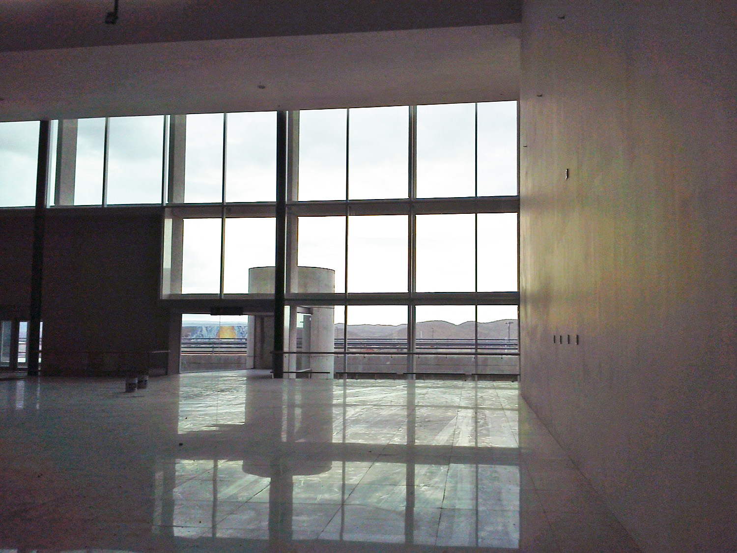 Estructura de acero parasoles de duroc fechadas lado tierra, lado aire accesos y costados cristal LOW-E y claro de 10mm laminado con centryglas